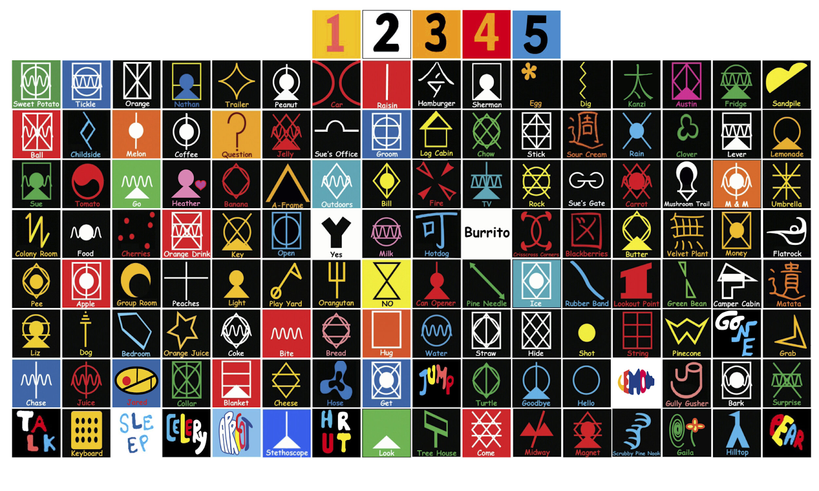 In the 1980s a bonobo named Kanzi learned how to communicate with humans using a keyboard of symbols. Researchers asked Kanzi questions and Kanzi responded. They also gave him a series of commands and he would perform them. Here’s an example keyboard that Kanzi used.